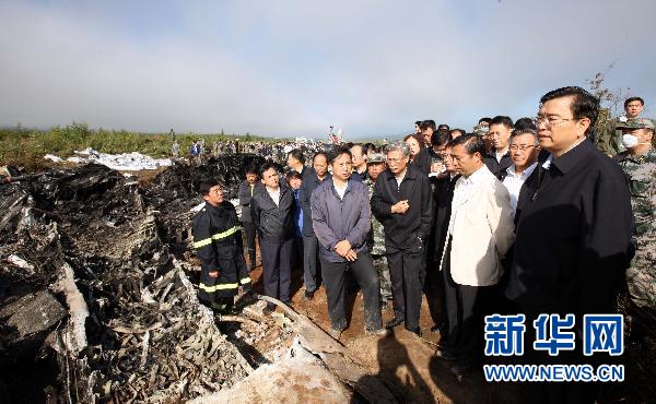 8月25日,中共中央政治局委员、国务院副总理张德江在事故现场。8月24日晚,河南航空有限公司(原鲲鹏航空公司)一架客机在黑龙江省伊春市降落时发生事故。事故发生后,中共中央政治局委员、国务院副总理张德江立即率交通运输部、公安部、卫生部、安全监管总局等有关部门负责同志连夜赶赴事故现场,指导抢救、善后处理和事故调查工作。新华社记者 姚大伟 摄