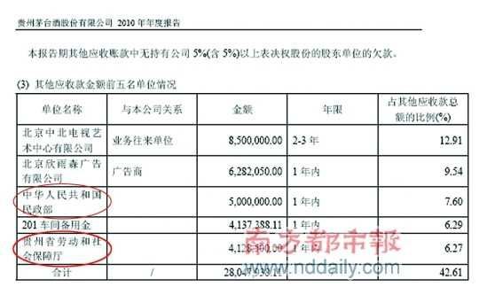 尽管贵州茅台2010年年报早已于3月21日发布,但仍被细心的网民发现,该公司年报的“其他应收账款前五名单位情况”中,中华人民共和国民政部、贵州省劳动和社会保障厅分居第二名和第四名,其中,民政部欠贵州茅台500万元,贵州社保厅欠贵州茅台412.85万元。