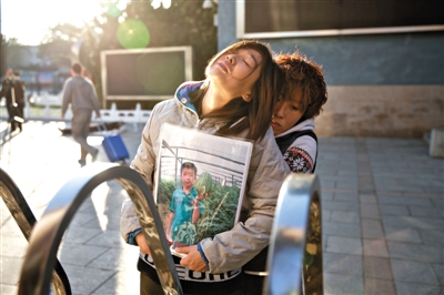昨日,“小粽子”的家人捧着他的照片站在校门口。10月23日,“小粽子”因在玩耍时弄伤同学被罚站,回家后跳楼身亡。新京报记者周岗峰摄
