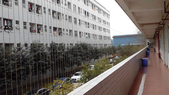 蓝思科技浏阳工厂宿舍楼外张起的铁丝网