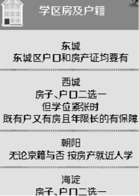 而西城、海淀在房产和户口上的选择余地就比较宽泛,只要具备户口在西城区,或者实际居住地在西城区(有房或租住公房),都可以按照各个小学的划片入学。但如果出现学生数量大于学位数时,就会依据顺序进行调剂。适龄儿童与父母户籍一致、住自有产权房且落户年限较长的有保障,将依据户籍性质、居住情况、落户年限等顺序入学。