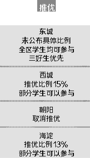 虽然市级教育主管部门对升学政策有着原则性的要求,但各个区县的升学政策又有着各自的独特性和差异性,加之发布的时间不统一,文件透明度不一致,让极度关心此事的家长,往往看得眼花缭乱,最终还是一头雾水。为此,北京青年报记者就四大区的升学政策进行了综合梳理,就读者最为关心的教育公正公开透明指标进行比较,试图描绘出一幅缩略图,以此为标尺,衡量哪个区的改革动作最大、升学政策最公平、教育资源最均衡、政策最透明……