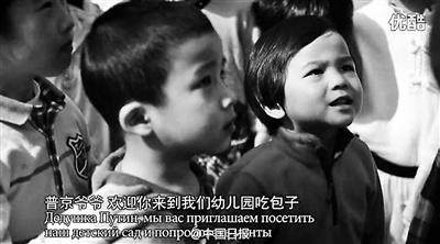 5分17秒的视频中,拍摄地点涉及了北京的莫斯科饭庄、俄罗斯驻华大使馆、俄罗斯商贸街、国际关系学院以及幼儿园等,受访人群也来自不同职业和年龄段,从幼儿园里的小朋友到骑自行车买菜的大爷,大家都从各自的视角回答了“提到俄罗斯你会想到什么”、“你眼中的普京”、“你想对普京说点啥”三个问题。