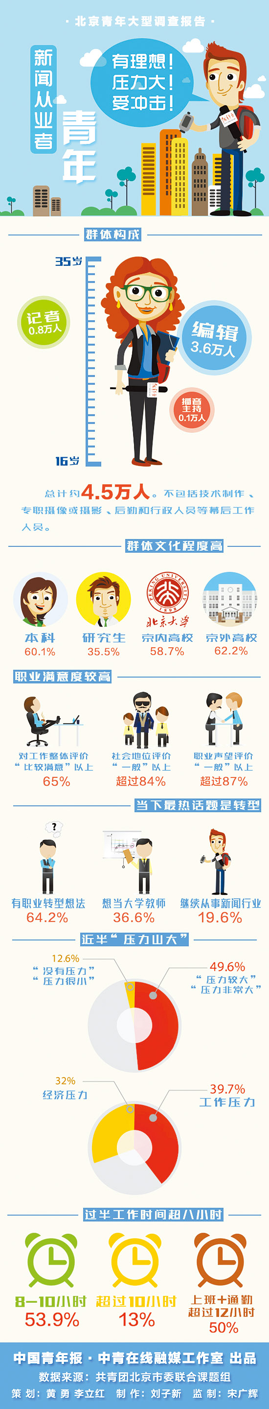 调查显示,新闻媒体从业者从事的是高强度的、脑力与体力劳动相结合的工作。工作8小时到10小时的占53.9%,超过10小时的占13%,在大多数媒体中超时加班已经成为一种常态。上班加上往返通勤,超过50%的人每天要超过12个小时。