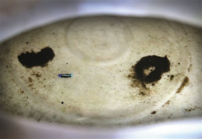 万子营东村“黑水厂”装满水的储水罐,罐底有大团沉淀物。