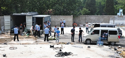 5月21日,龙爪树村,一家在集装箱内生产假桶装水的窝点被查。北京市食品药品稽查总队执法人员当场查获正在灌制的假桶装水30桶。