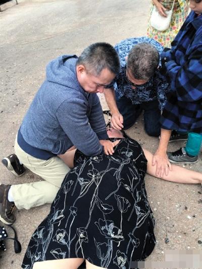 老太太晕倒在圣地亚哥海洋公园内的一座小桥旁边,晕倒后,她躺在一条满是石子的路上,没有时间考虑,为了保证动作规范,唐子人双腿直接跪在石子路上,为她做单人徒手心肺复苏。