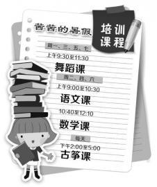 杨先生和爱人都要上班,一到暑假,管儿子成了“最头疼的事”。杨先生回忆,一开始儿子反抗得厉害,就用“提高零花钱”、“带他去旅游”等条件作为补课半个月的交换条件。他报出儿子的暑假课程表:上午8:10至12:10,是化学课和数学课,下午1:30至3:30是语文课和英语课,下午4:00至6:00是游泳课。