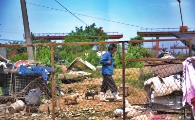 于从球的狗笼子大多不封顶,上面有一层很薄的黑纱布遮阳,地面温度不低于40摄氏度,很多狗被热得趴在地上一动不动。于从球的孙子和孙女平时就在这些黑纱布下的狗笼之间穿梭嬉戏。