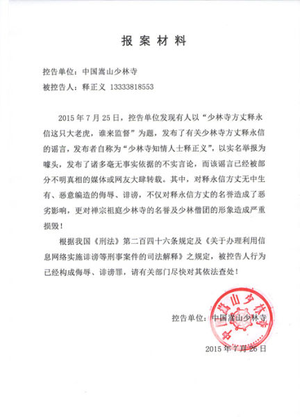 “释正义”对南方都市报记者表示,此次公开举报,“没有个人原因”,纯粹是因为看不惯释永信把少林寺变成目前这个样子。“希望少林寺能够回到一个佛门寺院应该有的样子,而不是成为他个人的工具”。举报帖中称,他2002年离开少林寺。此次举报是他的个人行为,“释正义”代表所有看不惯释永信目前所作所为的人。