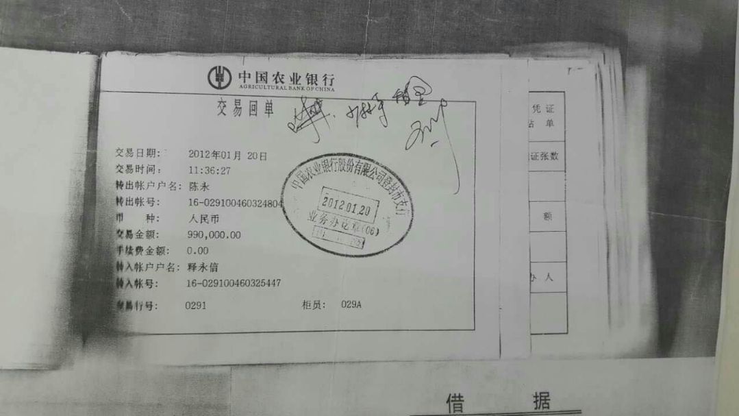 2012年1月20日,一个叫陈永的人通过中国农业银行,向释永信的账户转入99万元。26日还有一张一万元“领据”,标注为少林寺租金。另外释延鲁还有一张80万的借据,借款人是胡居明。释延鲁称该人是释永信表弟,在寺院做财务工作。