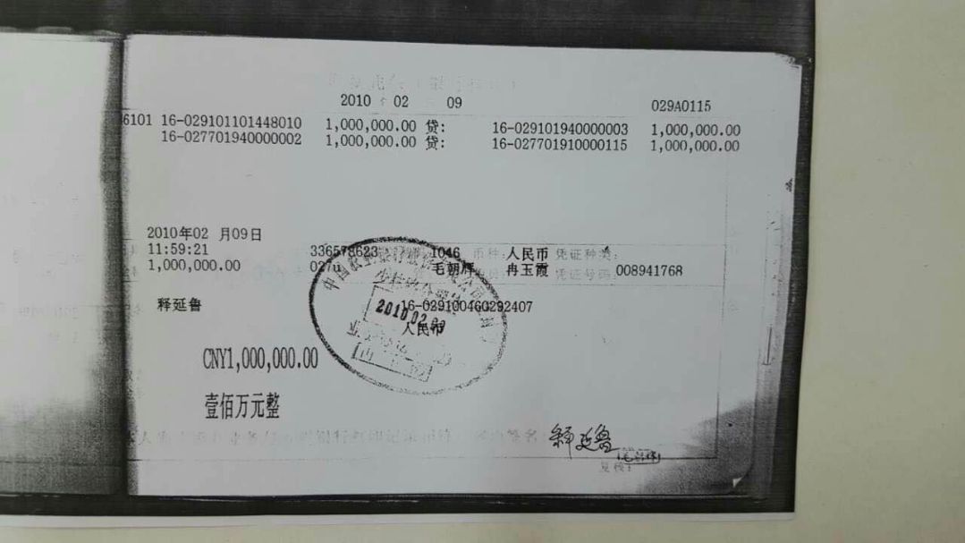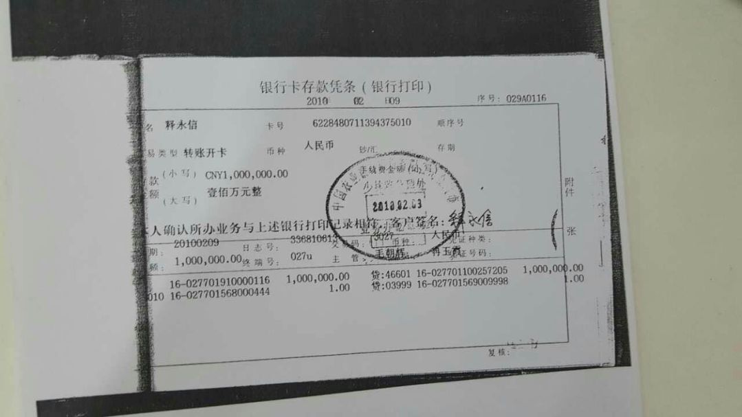 而释延鲁提供的证据中,确实有一张2010年2月9日释永信的银行转账开卡凭条,金额是100万元。同一天,释延鲁有一张100万元有“贷”款字样的银行票据。