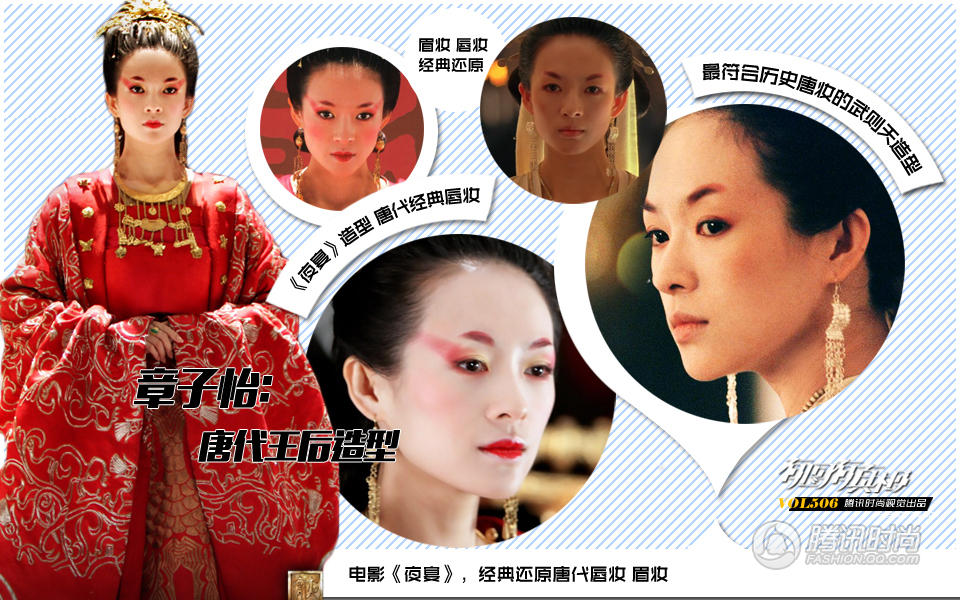 【章子怡:深情在睫,孤意在眉】“凤凰踏碎玉玲珑,孔雀斜穿花错落”,《夜宴》的故事阴霾华美,其中的造型更是斑驳从容。五代十国的历史背景总体仍属晚唐,章子怡的婉后造型在史实上更符合唐朝皇室女子的妆容。蛾眉两撇架空于鼻骨,眼影沿自然眼形斜向上,充满了戾气之美,对,戾气!就是这个词!章子怡能在短蹙的眉宇之间气定神闲地演绎女皇的暴戾骄纵和云淡风轻,所谓“深情在睫,孤意在眉”,可能最能形容这样一个气质多重的女人,当然,也能形容演她的这个女人啦。