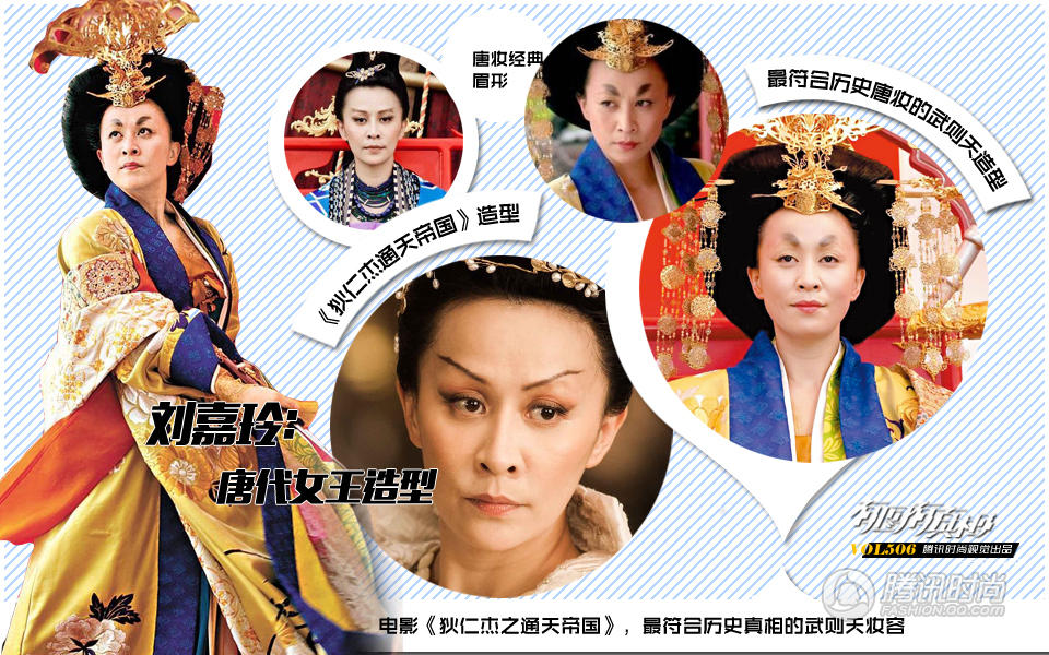 【刘嘉玲:一半海水,一半火焰】徐老怪心中的武则天身子里藏着半个男人,所以在他的镜头里刘嘉玲版的武皇就张狂犀利了许多。影片的造型指导是香港首屈一指的鬼手余家安,武皇的造型借鉴了敦煌壁画的真实飞天感和世界顶级造型师约翰?加利亚诺(John Galliano)、亚历山大?麦昆(Alexander McQueen)的T台造型技巧,穿上华服的嘉玲女皇额冠翠羽、玲饰满坠、眉宇生风、眼眸过电,一代女皇的威严与气场全在这鬼魅的影像造型里诠释着东方魔都的神往之势。