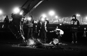 零时30分,施工准备就绪。铣刨机、清扫车、挖掘机等设备车辆从跑道北端出发,进入中跑道开始作业,铣刨机首先拆除跑道上的中线灯,也就是指引飞机滑行的信号灯。只见铣刨机的刀头先重重砸进地面,将信号灯周边地面破除,再将信号灯挖起。从外观上看,信号灯就好像一个大铁疙瘩,但是在其工作时,明亮的灯源将为机组做出指引,灯源周围的“铁衣”则可以将其安全地固定其中,不受损坏。所有信号灯拆除后,铣刨机将开始对道面施工,也就是粉碎道面,然后由渣土车运出渣土,之后才能进行新道面施工。
