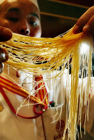 在七日的美食展记者会中,来自成都的点心主厨张寒勇切出金丝面精细如发丝,使用的却是刀面约四五十公分的鹅掌大刀;他一刀刀快速切出的面丝,甚至可以引火点燃。他说,材料的关键在金丝面是面粉混合鸡蛋做成,且不加水。