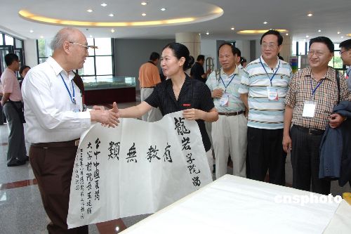 八月八日,台湾客家文化专家学者参观福建龙岩学院,台湾中国医药大学前院长王廷辅(前排左一)参观龙岩学院时书赠:“有教无类”。 中新社发 郑祚声 摄