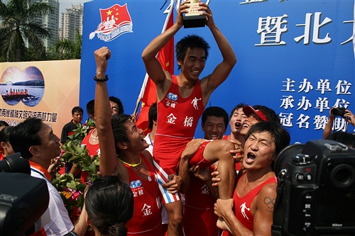 赛后,举行了两岸赛艇挑战赛的冠亚季军颁奖仪式和北大清华颁奖典礼。各支获奖队伍都表现出了极大的热情,特别是再次获胜的北大赛艇队,他们高高地举起奖杯,挥舞着黝黑的手臂,不断的欢呼,整个颁奖台成了他们激动表演的舞台,也吸引了大多数现场媒体的闪光灯。整个赛场,他们成了绝对的焦点。(徐丽麟)