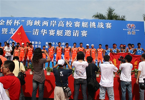 中国台湾网9月1日厦门消息 2007“金桥杯”海峡两岸高校赛艇挑战赛暨北大——清华赛艇邀请赛今天在厦门举行,广州华南师范大学赛艇队以8分15秒的成绩取得冠军,首次参赛的台湾辅仁大学队也取得第四名的优异成绩。而在已有8年历史的北大——清华赛艇邀请赛中,北大再次击败清华。赛后,兴奋的北大队员欢呼雀跃,他们成了赛场的绝对焦点。