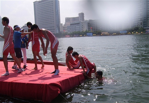 获胜后的北大队员们兴奋的跳入水中,在岸边拍摄的记者的相机镜头躲闪不及,被溅上了水花。