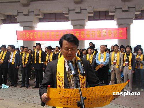 九月六日,参加海峡两岸高等教育西安论坛的代表来到陕西桥山,祭拜黄帝陵。图为台湾世新大学校长牟宗灿恭读祭文。 中新社发 冽玮 摄