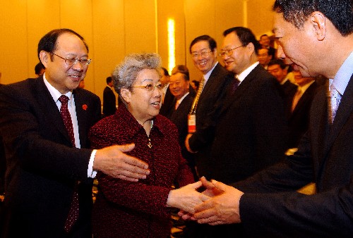 9月6日,中共中央政治局委员、国务院副总理吴仪在厦门与台湾工商界代表座谈。这是吴仪与台商代表握手。 新华社记者 姜克红 摄