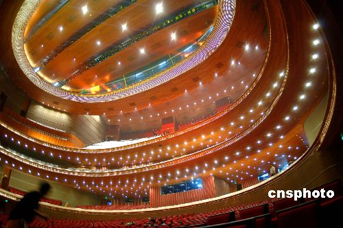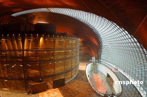 九月十七日,座落在北京长安街的国家大剧院壳体造型、内部剧院设施建设已基本结束,内部造型富丽堂皇。 中新社发 廖攀 摄