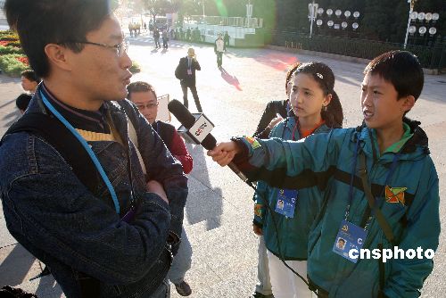 两名中央电视台特约小记者10月15日上午在北京人民大会堂采访台湾记者。中新社发 任晨鸣 摄