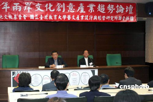 由台湾沈春池文教基金会主办的“两岸文化创意产业趋势论坛”十八日在台北开幕。台湾文化建设委员会副主委洪庆峰(右一)主持演讲会,来自北京的文化部文化产业司对外文化产业处处长高政印应邀(左一)作《谈大陆文化创意创意发展策略、特色与趋势》的演讲,前来旁听的学者和企业家挤满了学术报告庭。中新社发 耿军 摄