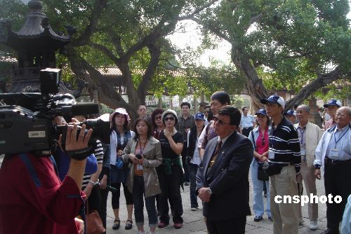 台湾新同盟会参访团一行三十五人在许历农会长的带领下,十九日到泉州古城参观考察,在参观了中国闽台缘博物馆后,还观看了具有闽台特色的民俗表演及木偶表演和南音演唱。图为参访团一行正在参观泉州开元寺。 中新社发 黄瑶瑛 摄