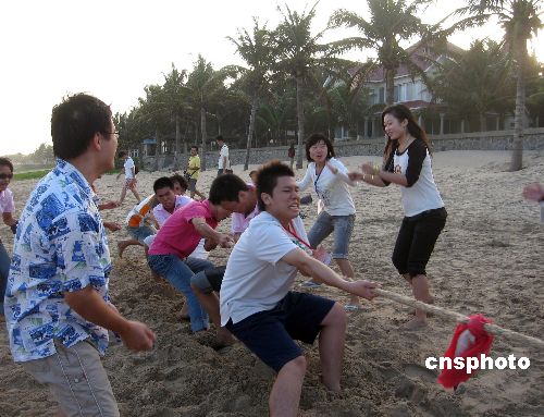 第二届“欢聚海南大学”两岸大学生冬令营11月13日举行“深深相连”沙滩拔河比赛活动。图为台湾学生奋力拔河,粉丝团在旁边呐喊助威。 中新社发 彭小云 摄