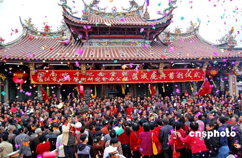 十一月二十六日,海内外林氏始祖闽南祖庙之一的“闽南比干纪念堂”,在福建晋江马平落成,来自美国、菲律宾等国家及港澳台与内地的林氏宗亲五千多人到场庆贺。“闽南比干纪念堂”为供奉忠臣比干公而建,一九九七年奠基,历经十年投入一千一百多万元人民币建成。据记载,比干是殷商帝太丁的儿子,与纣王之父太乙为兄弟,为殷商少师,公元前1123年因忠心进谏被纣王所杀,被认为是中国有史记载的一位伟大爱国者,也是世界林姓人的太始祖。中新社发 傅丹丹 摄