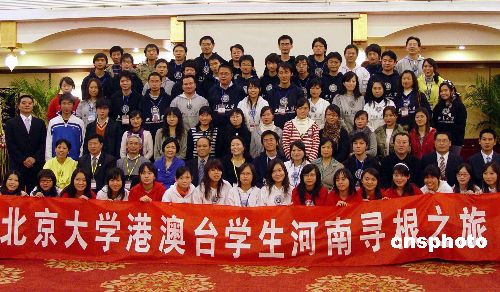 十一月二十六日晚,北京大学来自港澳台地区的六十四名学子和河南郑州大学的二十名师生合影留念。当日,北大港澳台学子“中原寻根之旅”启动,将对中原地区的河南进行政治、经济、历史、文化等方面的考察,以增进北大港澳台学子对中原文化及国情的了解。 中新社发 李志全 摄