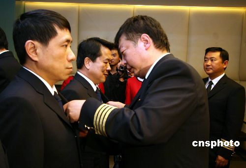 12月10日,四川航空集团公司继两年前在大陆首家引进8名台籍飞行员后,再次引进12名台籍飞行员。图为川航负责人在第二批台湾飞行员开飞仪式上,为他们佩戴飞行胸章和领带。 中新社发 蔡超 摄