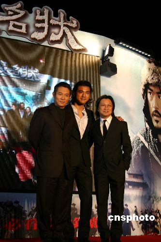 年底最瞩目的华语大片《投名状》十八日晚在台北举行了首映礼。导演陈可辛带领片中明星李连杰、金城武等人参加首映会,并点燃礼花庆祝。中新社发 陈国华 摄