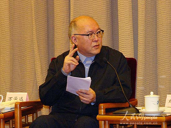 浙江省原省长、人事部原副部长万学远在座谈会上发言。
