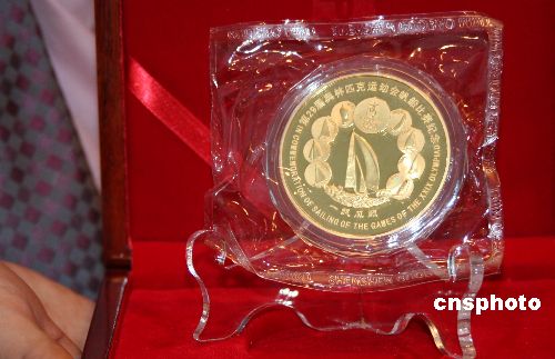 由中国台北奥委会、台湾大洋金银币有限公司主办的“二00八年北京第二十九届奥运会纪念金银币慈善拍卖会”将于一月二十七日在台北诚品书店信义店展演厅举行。图为大洋金银币有限公司提供,将在拍卖会上拍卖、由中国金币总公司发行的北京奥运会分会赛场“一帆风顺”五盎司纪念金章。中新社发 陈立宇 摄