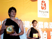 一月二十七日,由中国台北奥委会和台湾大洋金银币有限公司共同主办的“二00八北京第二十九届奥运会纪念金银币慈善拍卖会”在台北举行。图为拍卖会上,两名男女模特正在展示北京奥运会场馆鸟巢金银微缩复制品。中新社发 陈立宇 摄