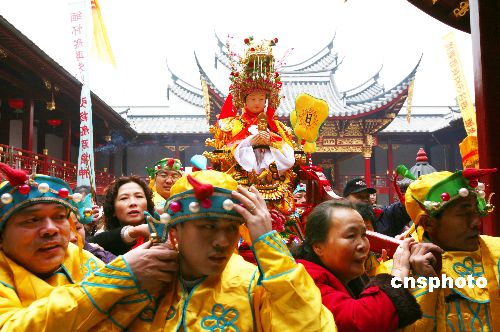 1月24日,由福州马尾区政府投资近千万元重建的世界唯一一座船政天后宫竣工。当日上午,两岸宗教界有关人士和妈祖信徒举行船政天后宫竣工和恭迎妈祖金身安座仪式。据了解,船政天后宫将于春节期间,即可向公众开放。背景资料:这座始建于1868年春季、耗资3082两白银的船政天后宫,在历次战乱中屡遭不测,最终在1971年被拆毁。为弘扬船政文化,福州市马尾区政府决定重建船政天后。2005年10月开工,在原址上按原比例扩大1/3规模重建,总用地面积7205平方米,建筑总面积1500平方米,门楼高12米、面阔27.22米,主殿5开间,进深8.3米。总体布局为一轴二进二院。一进为门楼,恢复原貌;下中庭为戏台,上中庭为拜阁;二进为供奉妈祖及配神的大殿。后院为魁星阁等。按天后宫的原有格局、组织结构形成历史脉络,共分三个功能区:祭妈祖庙宇区、接待陈列与附属设施区和休闲区。 中新社发 汪虎 摄