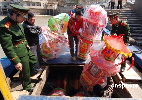 13日上午,象征“两马同春”的双马灯、喜气洋洋的宫灯、走马灯、手提灯,以及奥运福娃造型的花灯共900多盏,在连江县黄岐港装船运往马祖(上图),拉开了第六届“两马同春闹元宵”活动的序幕。