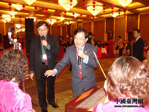 纽约中国和平统一促进会会长花俊雄和台湾中国统一联盟主席王津平共同唱起台湾民谣《绿岛小夜曲》和《望春风》。(摄影:钟宝华)