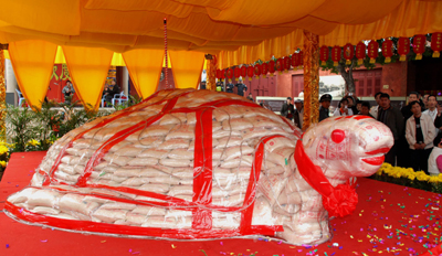 2月22日,福建泉州天后宫举行传统民俗“平安乞龟”揭彩仪式。当日,来自海峡两岸的300多人参加了“平安乞龟”揭彩仪式,这是福建泉州天后宫连续第二年与台湾澎湖天后宫联合举办“乞龟”元宵祈福活动。由1万公斤大米堆砌而成的“大米龟”头高1米,背高1.5米,长7米,宽近5米。”乞龟“是澎湖元宵节的特色民俗。新华社发(颜财斌 摄)