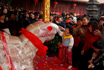 2月22日,福建泉州天后宫举行传统民俗“平安乞龟”揭彩仪式,一名小朋友抚摸“大米龟”。新华社发(颜财斌 摄)