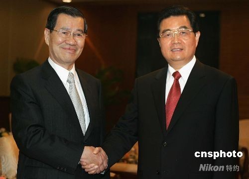 4月12日下午,国家主席胡锦涛在海南省博鳌会见出席博鳌亚洲论坛2008年会的两岸共同市场基金会董事长萧万长。 中新社发 任晨鸣 摄