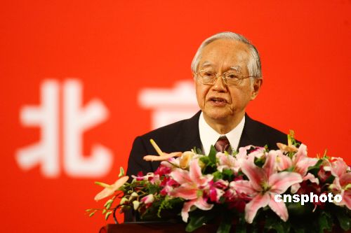 资料图片:二00六年四月十四日,国共两岸经贸论坛在北京开幕,著名经济学家吴敬琏在论坛上发表演讲。 中新社发 盛佳鹏 摄