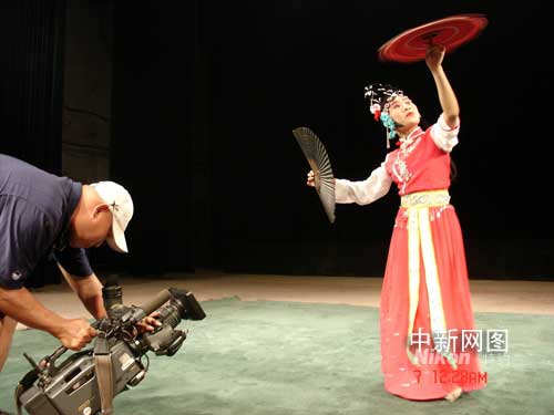 摄制组人员拍摄山西运城市艺术学校小梅花演员的演出。