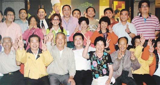 台祥鹤旅游团11名首批脱困团员,昨天晚上接受成都市台商协会宴请,许多团员合影时比出“ya”手势,庆幸历劫归来。(中央社) |