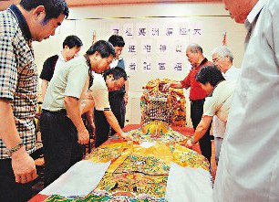 中新网5月28日电 台湾云林县西螺广福宫日前至大陆湄洲岛进香谒祖,祖庙感念分灵多次“探亲”,特致赠妈祖金身神袍,历史上百年,全台仅此一件。广福宫如获至宝,昨天展示,吸引不少民众争睹祖灵风采。