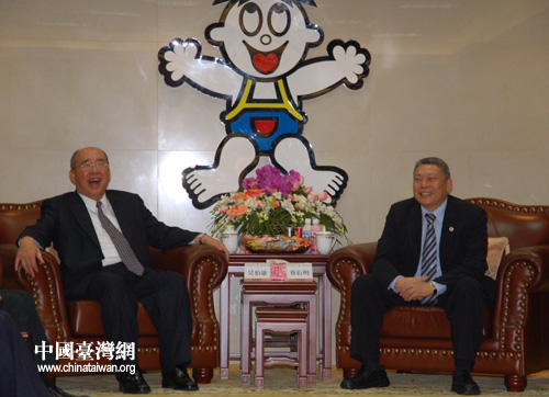 吴伯雄一行参观位于上海的旺旺集团总部,吴伯雄与旺旺集团董事长蔡衍明相谈甚欢。(摄影:中国台湾网 田云鹏)