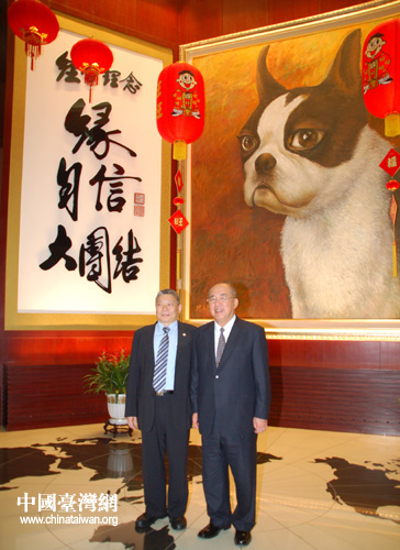 吴伯雄与蔡衍明,在蔡衍明幼时的最爱“黑皮”画像下合影。(摄影:中国台湾网 田云鹏)